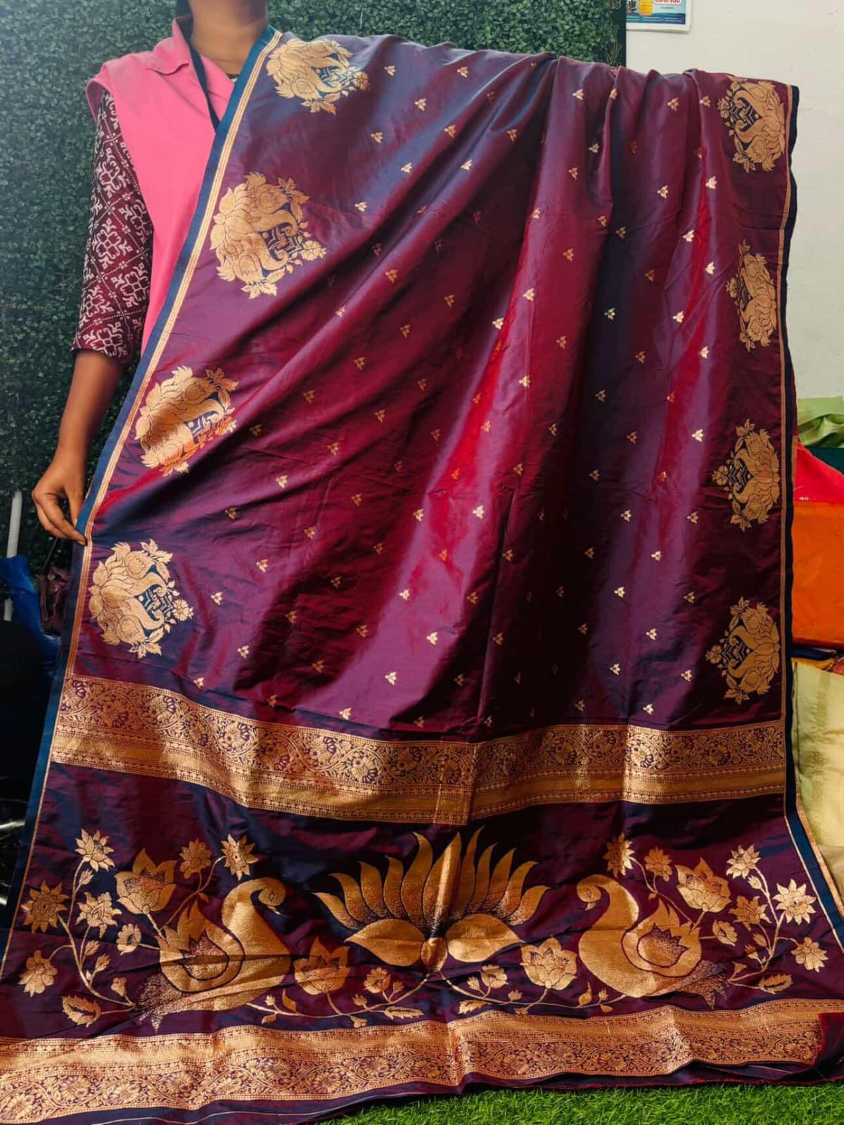Banaras Saree  at affordable  prices are here at Thirumala Sarees! These sarees have minor weaving imperfections and slight damages. Perfect for casual wear or styling experiments, they’re a blend of beauty and budget-friendly charm. Visit us at Boduppal to explore this exclusive collection.